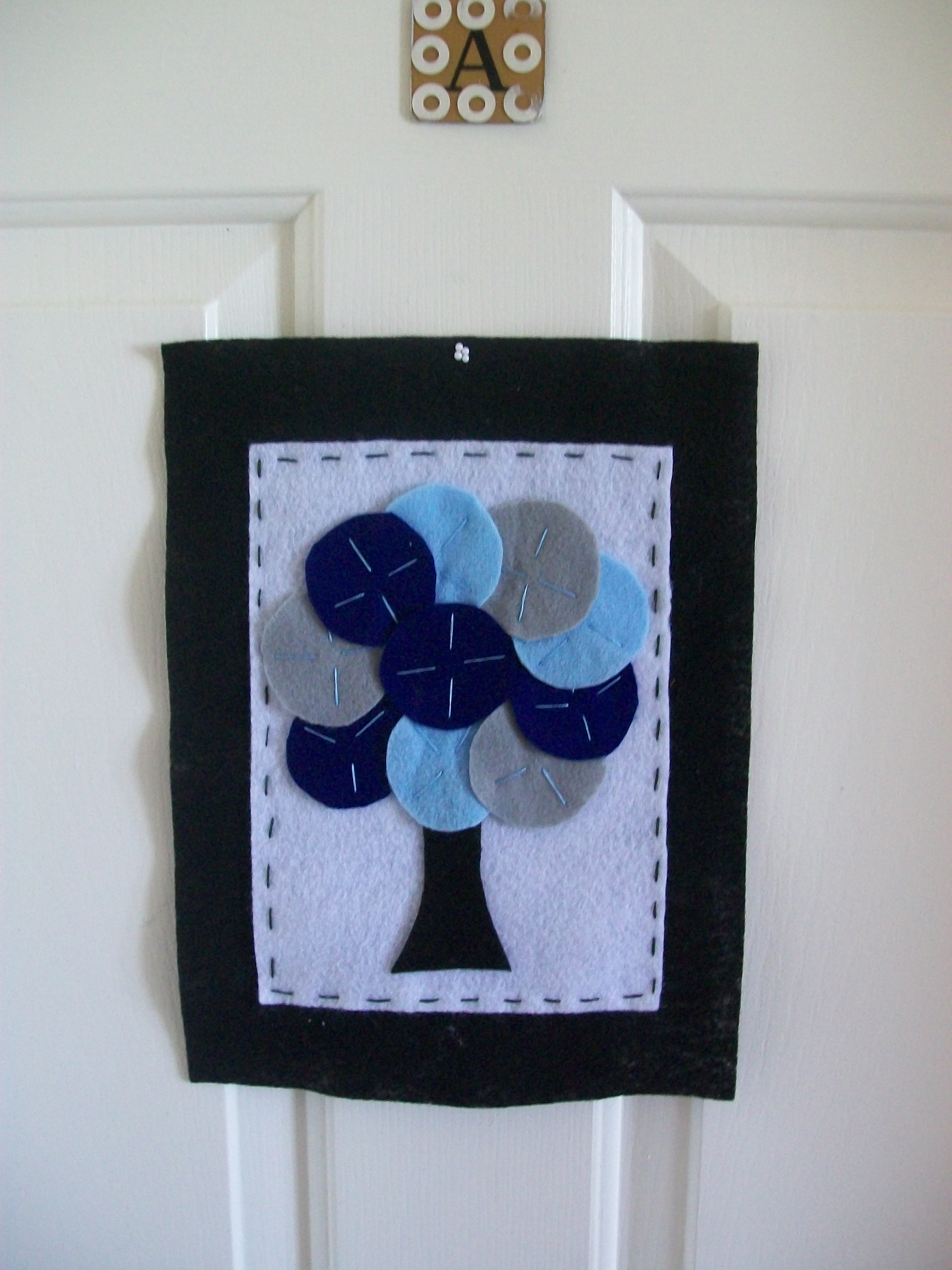 I haven’t crafted anything since August. How sad. School and work have gotten in the way lately, but that was to be expected. While I had some free time last month, I was able to crochet an adorable shamrock garland for my window and sew a felt tree wall hanging for my door. I’m absolutely in love with the original crafter’s felt products, so I couldn’t resist making something else for myself. During the summer last year, I made a pillow with her basic tree motif (minus the Amy Butler fabric I’m in LOVE with), and I thought this wall hanging was another adorable way to incorporate the tree.