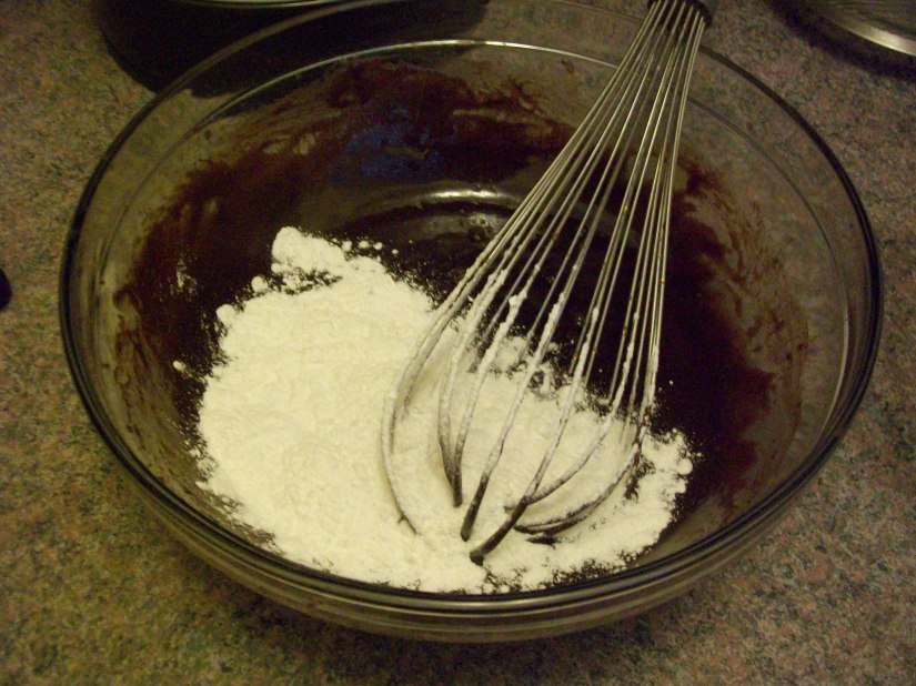 For some reason I failed to take pictures of mixing everything together, but it really just wasn’t that interesting. I added the chocolate to the eggs and sugar and alternated adding the dry ingredients and buttermilk/vanilla mixture.