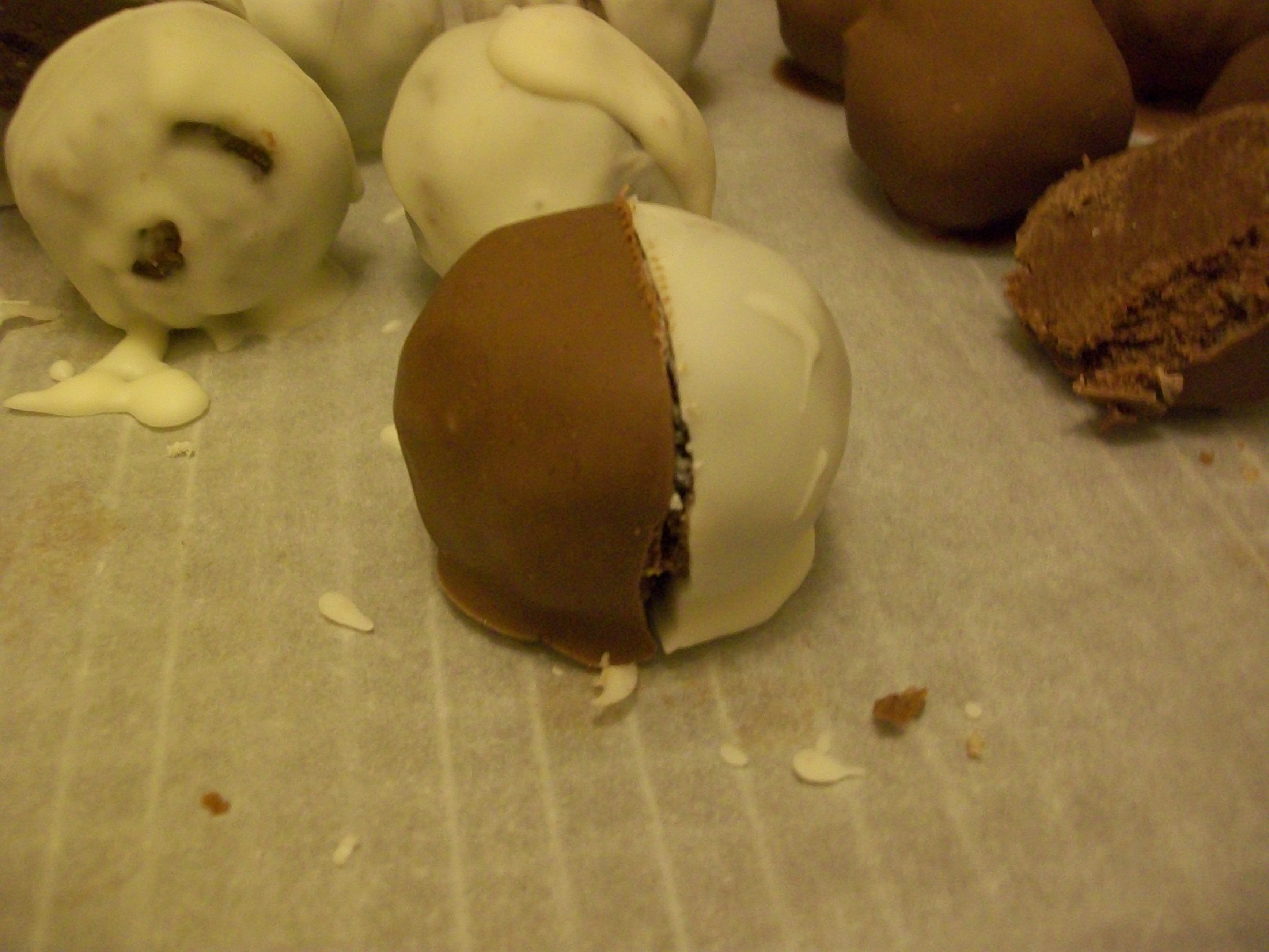 Just like I needed to figure out (but this time quickly) what to do with these cupcakes that completely stuck to the pan because I don’t like to use liners (I’m a huge fan of the outside layer of cakes/cupcakes/brownies. I love that contrasting texture. Yum!). I had crumbled cake in one hand and delicious chocolate buttercream in the other. That could only mean one thing: CAKE BALLS! I crumbled up the failed cupcakes (they still tasted okay, thank goodness) and mixed them in with the frosting.
