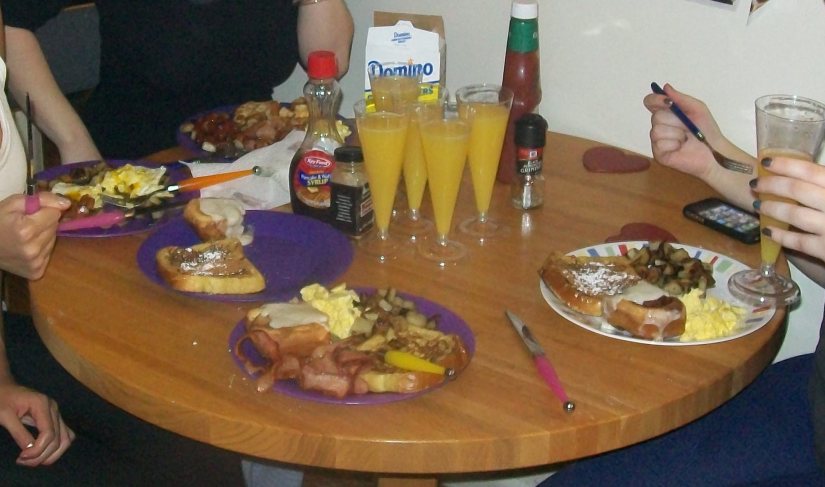 Cinnamon rolls, scrambled and sunny-side up eggs, french toast, homefries, BACON, and mimosas. The perfect study food, don’t you know.