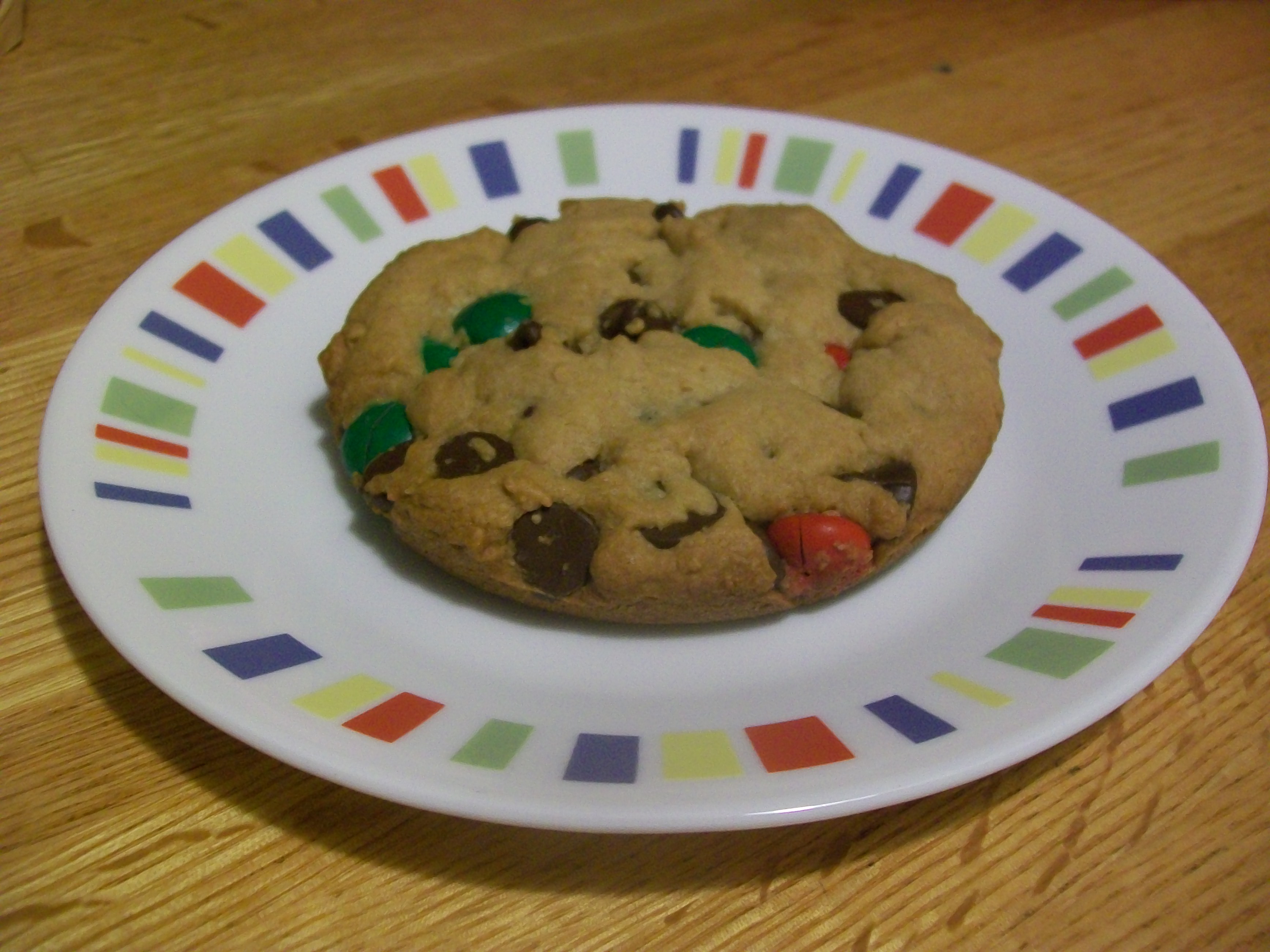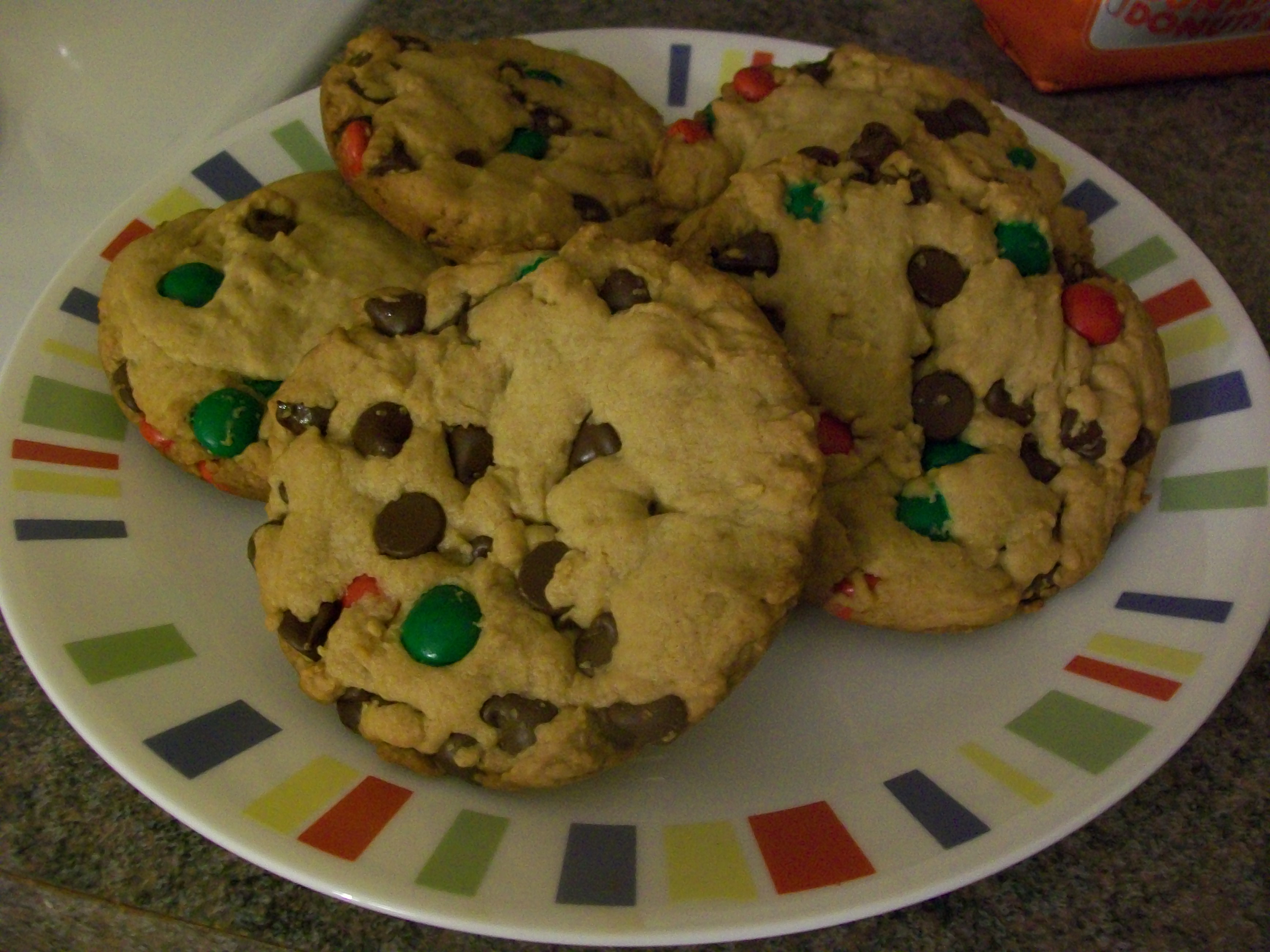 I used Picky Palate’s XXL M&M Chocolate Chip Cookie recipe. I had made a conscious effort to save my Christmas candy for baking purposes, and I’m glad I did. The cookies had a bit of a late Christmas theme because my M&M’s were from the Christmas candy cane containers. I didn’t have quite as many as I wanted, but I made up the difference by adding some extra chocolate chips.