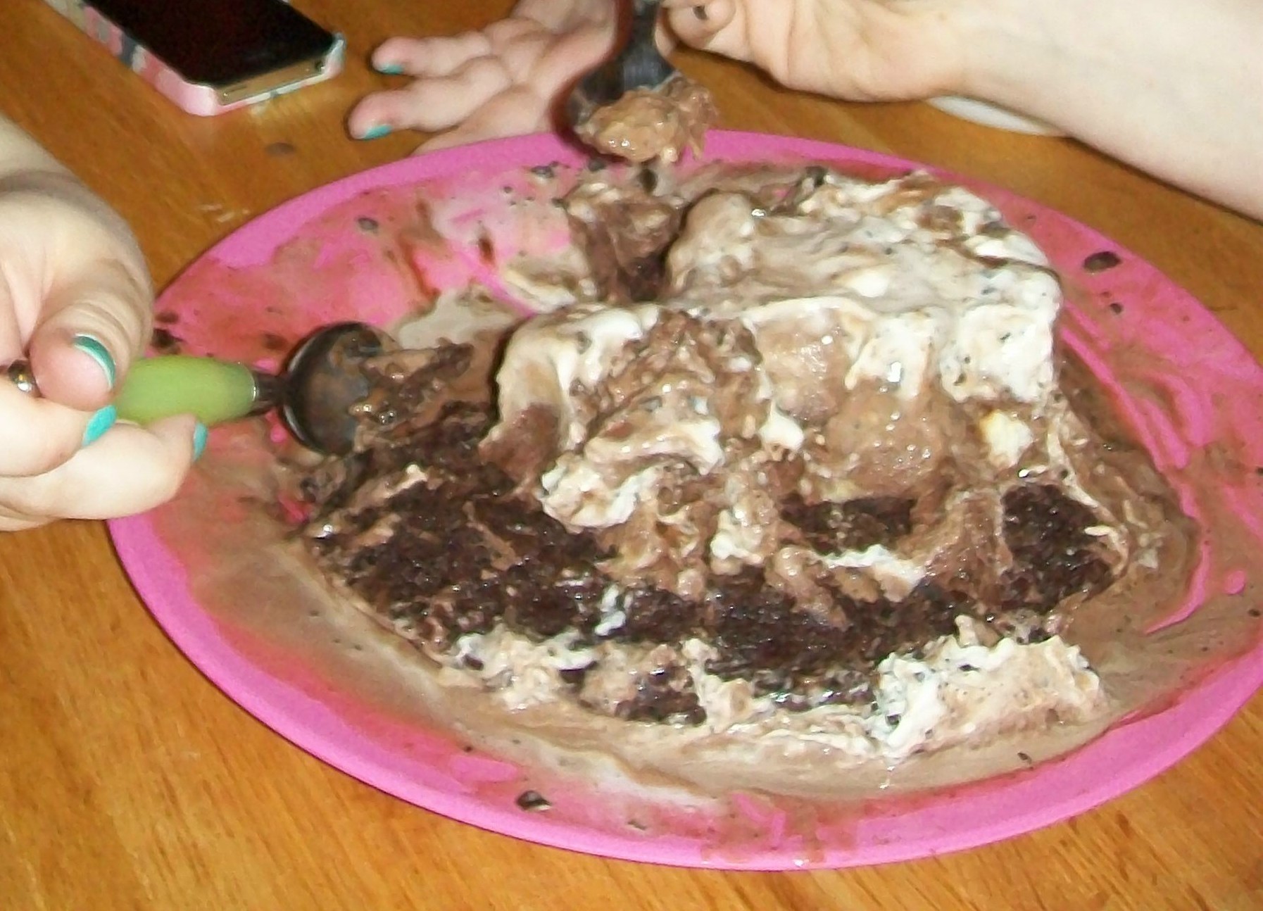 We let the bomb stay in the freezer for the rest of the night and vowed to try again the next day. I managed to coerce it back into the bowl and into a semi-dome shape, but by then the different ice cream flavors had sort of mixed, so the layer effect was lost. We sang Happy Birthday and got ready to eat, but we found that the brownie had also frozen rock hard, so I could barely cut through it. Not to be deterred, the four of us cast aside our bowls and dug right in with our spoons. It was delicious!