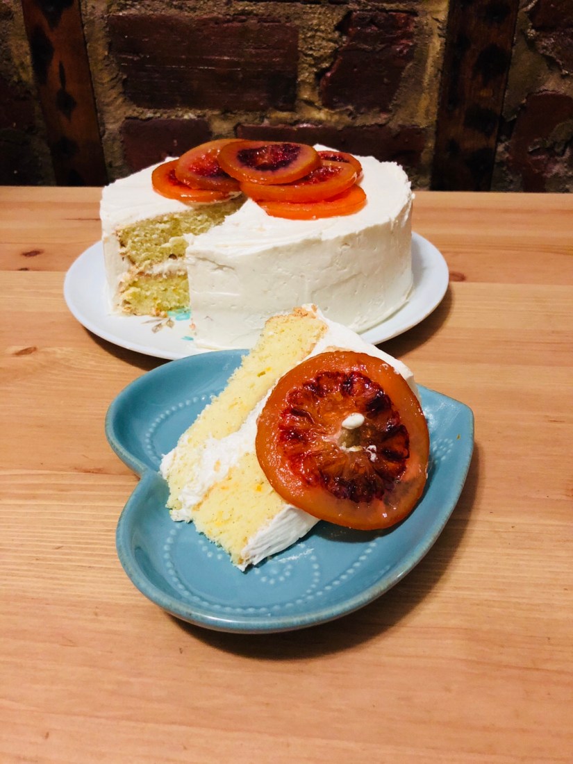The blood oranges took forever and a day to candy, and I was a bit terrified of accidentally deflating the egg whites, but I’m quite pleased with the final results! The cake has a nice orange fragrance, and I cut the sugar by a half cup so the frosting isn’t overly sweet.